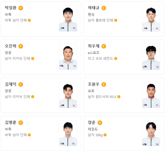 - 펜싱: 최인정, 오상욱, 구본길, 송세라, 윤지수, 김정환, 하태규, 허준, 임철우, 강영미, 김준호, 이혜인, 이광현